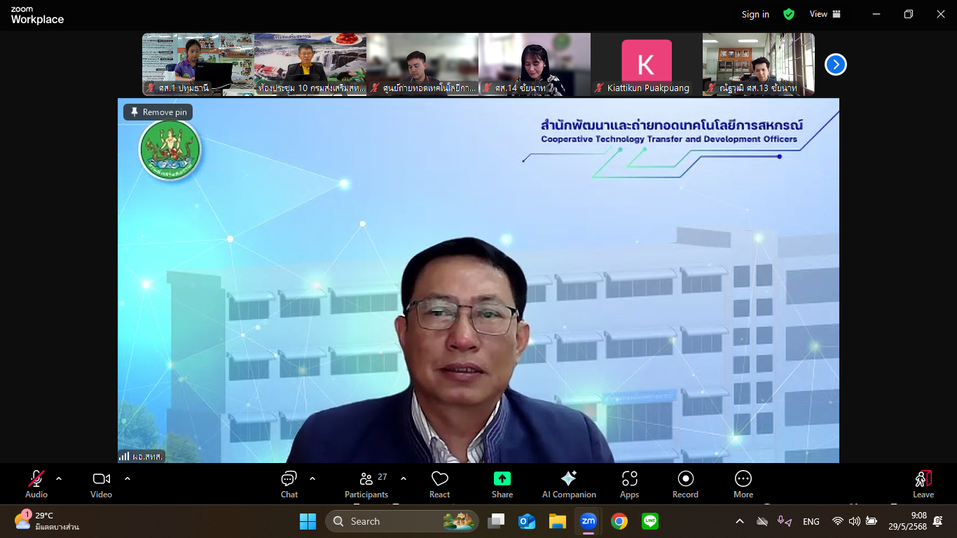 วันที่ 29 พฤษภาคม 2568 นางสาวพัสตราภรณ์ โคมแก้ว ผู้อำนวยการศูนย์ถ่ายทอดเทคโนโลยีการสหกรณ์ที่ 1จังหวัดปทุมธานี มอบหมาย นางสาวปานฟ้า พรหมแก้ว นักทรัพยากรบุคคลปฏิบัติการ เข้าร่วมโครงการฝึกอบรบ หลักสูตร “Plickers Application ที่ใช้ในการจัดกิจกรรมการอบรม” ผ่านระบบออนไลน์ โดยมีนายพิษณุ พินรอด ผู้อำนวยการสำนักพัฒนาและถ่ายทอดเทคโนโลยีการสหกรณ์ เป็นประธานในพิธีเปิดโครงการฯ วัตถุประสงค์เพื่อให้ผู้เข้าอบรมสามารถนำแอปพลิเคชั่น Plickers ไปใช้ทำกิจกรรมถาม-ตอบแบบ Real-time ในโครงการฝึกอบรม พัฒนากิจกรรมการเรียนการสอนและการฝึกอบรมให้น่าสนใจมากขึ้น โดยผู้เข้ารับการอบรมสามารถมีส่วนร่วมกับกิจกรรม โดยที่ไม่ต้องใช้อุปกรณ์เทคโนโลยีใดๆ ถ่ายทอดสัญญาณจากศูนย์ถ่ายทอดเทคโนโลยีการสหกรณ์ที่ 12 จังหวัดพิษณุโลก ร่วมประชุมผ่านระบบประชุมออนไลน์ Zoom Meeting ณ ศูนย์ถ่ายทอดเทคโนโลยีการสหกรณ์ที่ 1 จังหวัดปทุมธานี อำเภอคลองหลวง จังหวัดปทุมธานี
