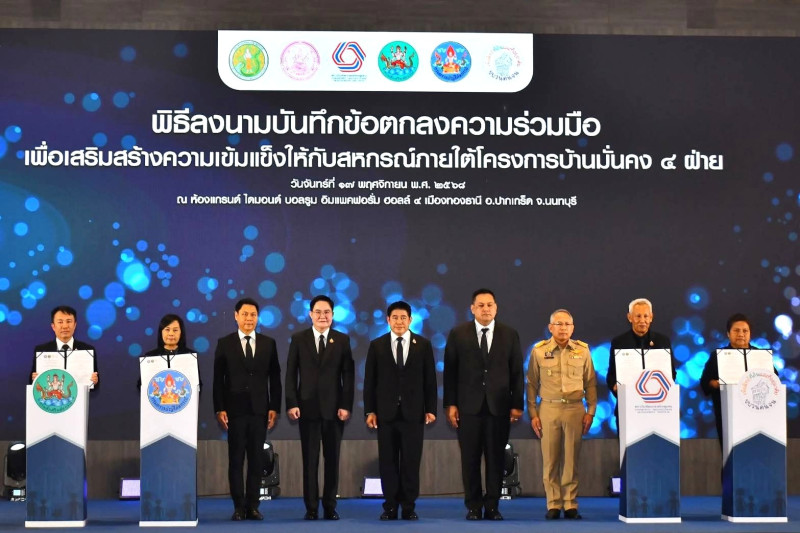 วันที่ 17 พฤศจิกายน 2568 ร้อยเอก ธรรมนัส พรหมเผ่า รองนายกรัฐมนตรี และรัฐมนตรีว่าการกระทรวงเกษตรและสหกรณ์ เป็นประธานเปิดงานสัมมนา “เครือข่ายสหกรณ์ชุมชนบ้านมั่นคง : เครื่องมือการพัฒนาชุมชนเข้มแข็ง“ โดยมี นายอัครา พรหมเผ่า รัฐมนตรีว่าการกระทรวงการพัฒนาสังคมและความมั่นคงของมนุษย์ นายอามินทร์ มะยูโซ๊ะ รัฐมนตรีช่วยว่าการกระทรวงเกษตรและสหกรณ์ร่วมเป็นสักขีพยาน พิธีลงนามบันทึกข้อตกลงความร่วมมือเพื่อเสริมสร้างความเข้มแข็งให้กับสหกรณ์ภายใต้โครงการบ้านมั่นคง 4 ฝ่าย โดยนายนิรันดร์ มูลธิดา อธิบดีกรมส่งเสริมสหกรณ์ ร่วมลงนาม กรมตรวจบัญชีสหกรณ์ สถาบันพัฒนาองค์กรชุมชน (องค์การมหาชน) และเครือข่ายสหกรณ์เคหสถานบ้านมั่นคง ในการนี้ นางสุชาดา เคนพิทักษ์ สหกรณ์จังหวัดปทุมธานี พร้อมคณะเจ้าหน้าที่สำนักงานสหกรณ์จังหวัดปทุมธานี และนางสาวพัสตราภรณ์ โคมแก้ว ผู้อำนวยการศูนย์ถ่ายทอดเทคโนโลยีการสหกรณ์ที่ 1 ปทุมธานี และสหกรณ์บ้านมั่นคงในจังหวัดปทุมธานี ร่วมรับมอบรางวัลสหกรณ์ที่ปิดบัญชีได้และเข้มแข็ง ณ ห้องแกรนด์ ไดมอนด์ บอลรูม อิมแพคฟอรั่ม ฮอลล์ 4 เมืองทองธานี อำเภอปากเกร็ด จังหวัดนนทบุรี